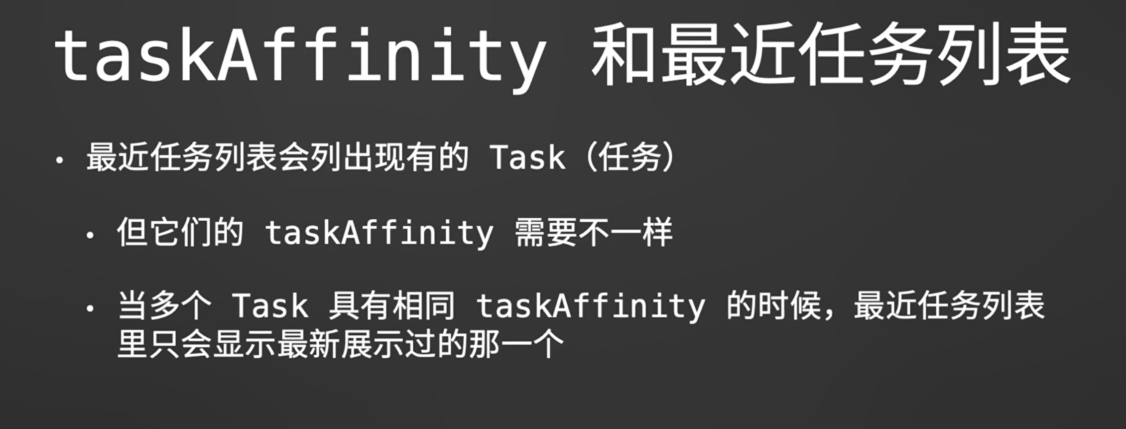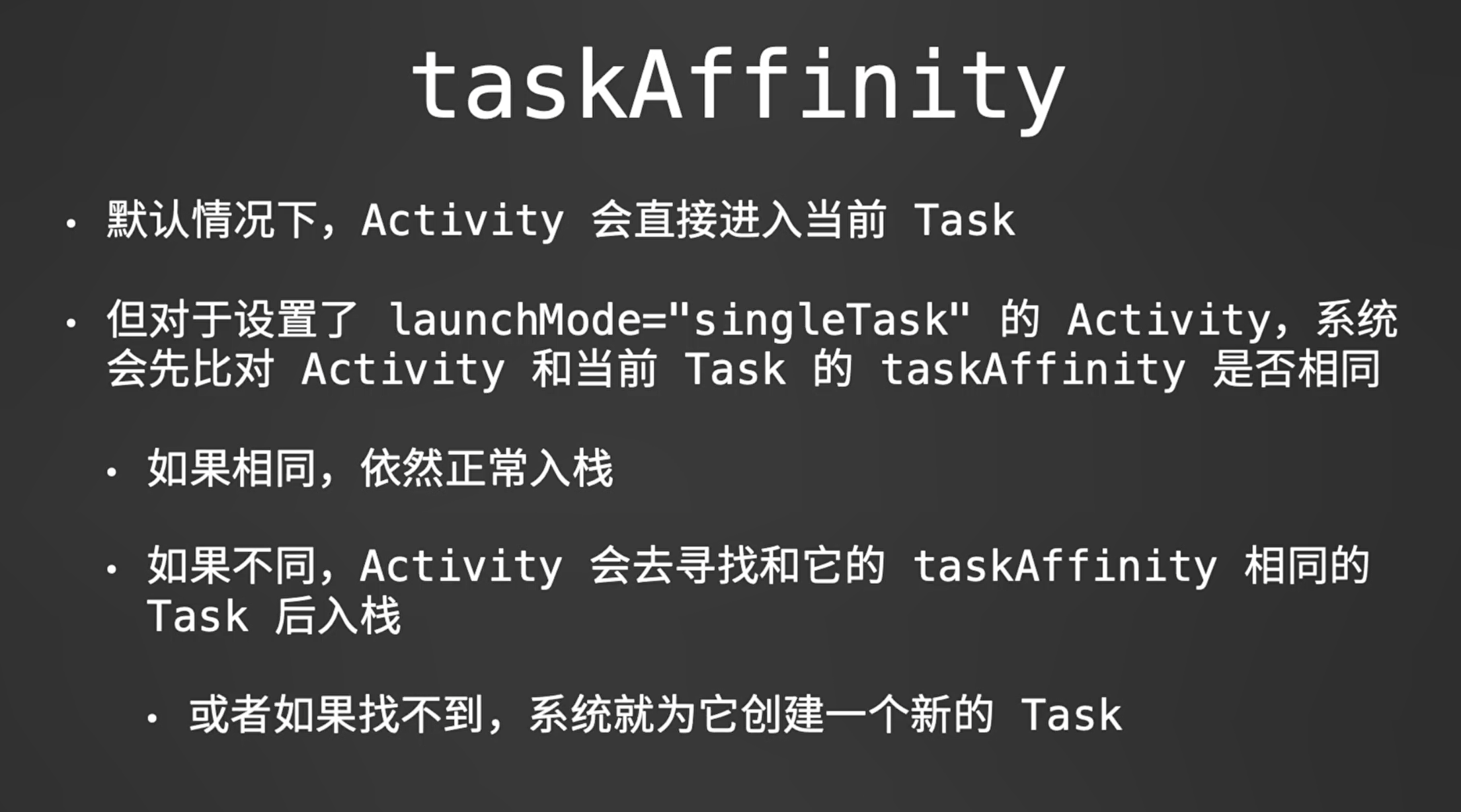 再来说说什么是taskAffinity?默认情况下,所有Activity都有一个taskAffinity属性且值是应用的包名,我们也可以为每个Activity单独指定taskAffinity属性,这会导致Activity进入Task的方式也不同,这个在后面慢慢分析。